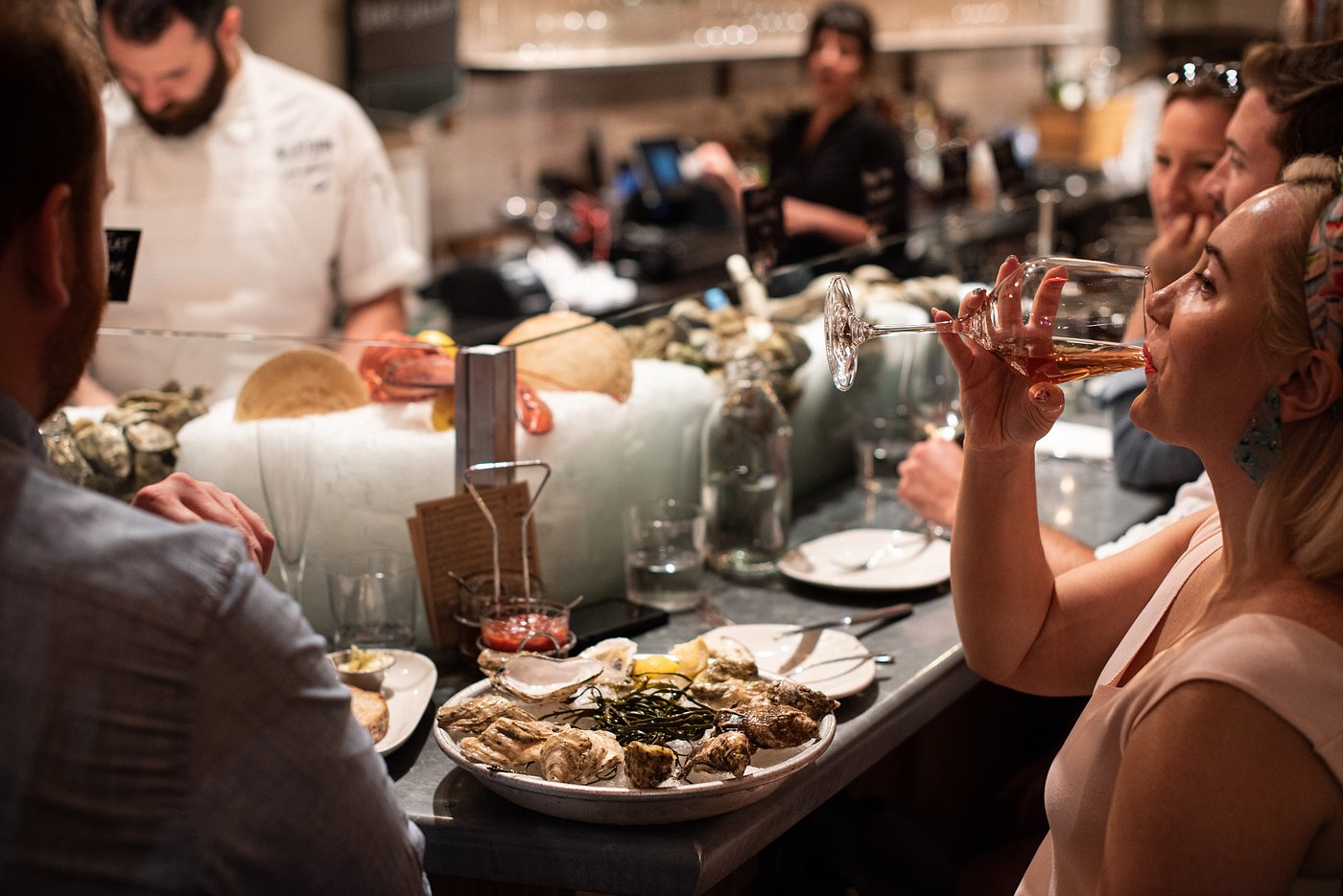 Offene Austernbar, Tagesfang vom Markt, Holz- und Grillgerichte, entspannte Marktatmosphäre, umfangreiche Auswahl an Wein, Craft-Bier und Cocktails, Michelin-Hinweis und beliebter Treffpunkt für Einheimische